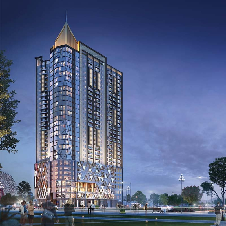 SQ Theme Park Tower in Bahria Town Karachi rises up to eight storeys above the ground floor. The project has set new standards in luxury apartments, commercial shops and offices.